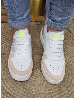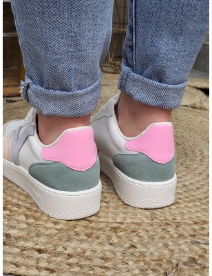 Baskets femme Victoria Madrid cuir blanches avec petite plateforme et empiècements colorés en suédine