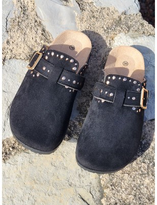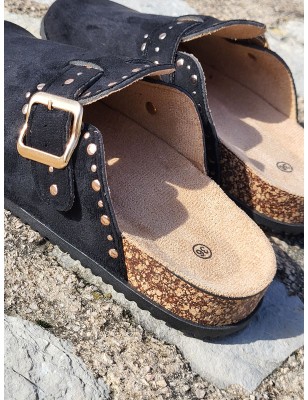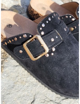 Sabots femme Moyana noirs effet suédine avec boucle et clous décoratifs dorés