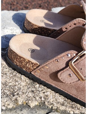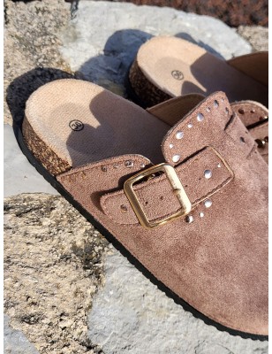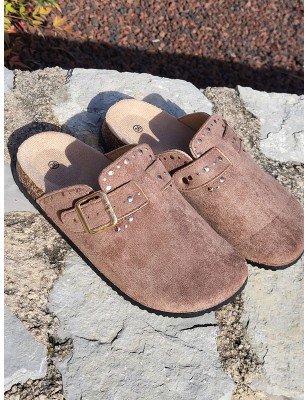 Sabots femme Moyana marron effet suédine avec boucle et clous décoratifs dorés