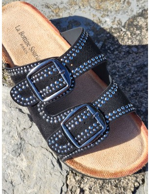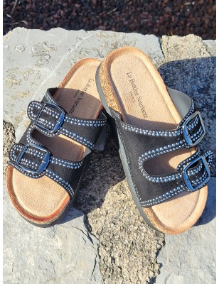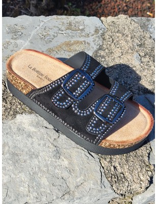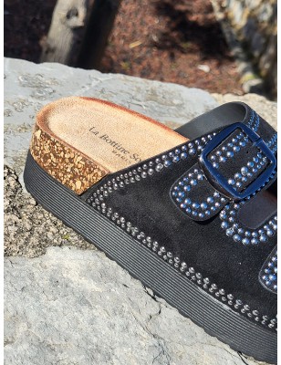Mules compensées femme Charline noires avec grosses brides effet daim et clous argentés
