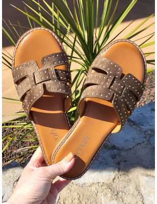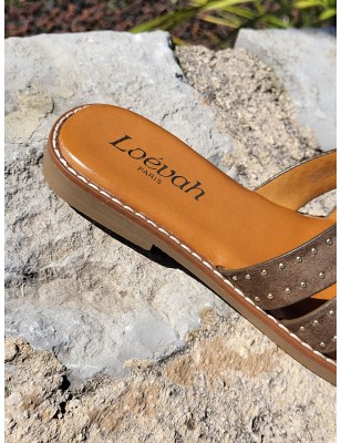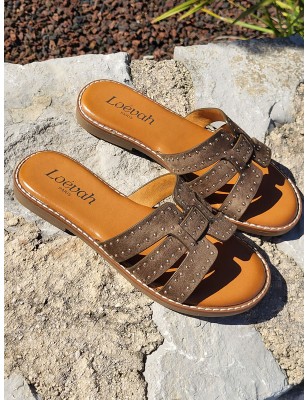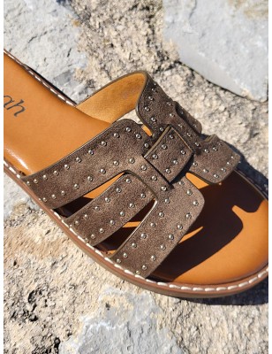 Mules femme Gina kaki avec bride cloutée et ajourée effet daim