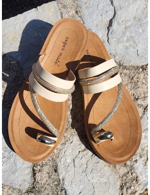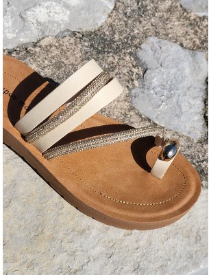 Mules femme Mariani beiges avec brides en strass et entre-doigts avec bijou