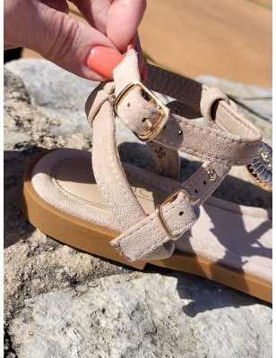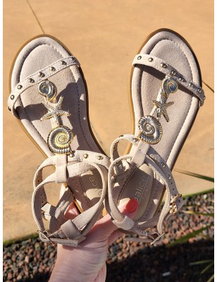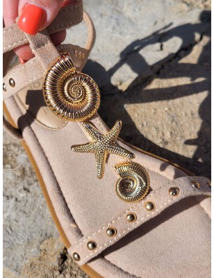Sandales Louiza beiges avec brides effet suédine cloutées et bijoux coquillages dorés