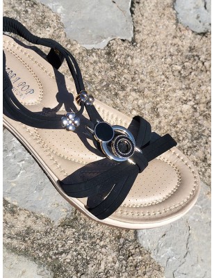 Sandales femme Elaura noires avec brides effet suédine et ornements dorés